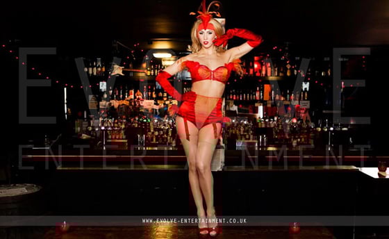 With her trademark red feather costume encircled with fiery plumage, this stunning act will tantalise all your senses. She is not only super hot she has an amazing stage presence and seduces the audience, while stripping down to nipple tassels.