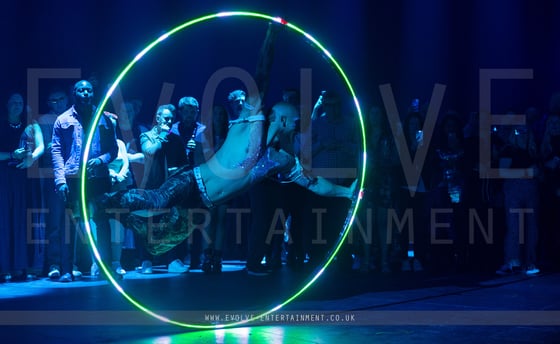 Wheel performance in the crowd! A cube of lights descended into the crowd, providing a dramatic stage for our performer. This visually stunning act was a testament to the client's vision and added a futuristic twist.
